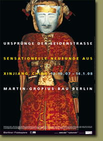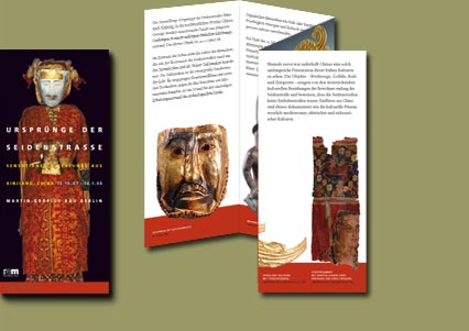 Plakat und Faltblatt für die Ausstellung „Ursprünge der Seidenstrasse Sensationelle Neufunde aus Xinjiang ", im Martin-Gropius-Bau, Berlin